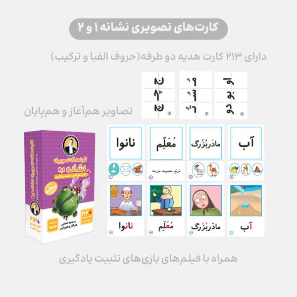 اين محصول شامل ۳۸۲ صفحه است و جهت آموزش نشانههای ١ و ٢ در كلاس اول دبستان طراحی شده و ويژه آموزش حروف كتاب فارسی است. در این ابزار پشت هر کارت تصاویر همآغاز و همپایان جهت تدریس بهتر و ۲۱۳ کارت حروف الفبا و کارت ترکیب به عنوان هدیه و برای انجام انواع بازیهای پیشگیری از اختلال در یادگیری طراحی شده است. ویدیوی این بازیها را میتوانید در سایت آموزشی آقای پرلز ببینید.